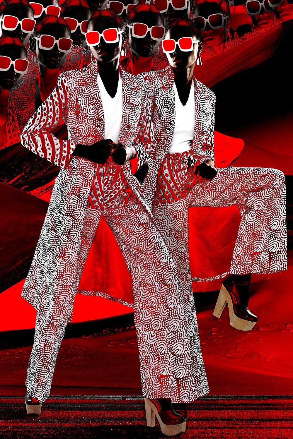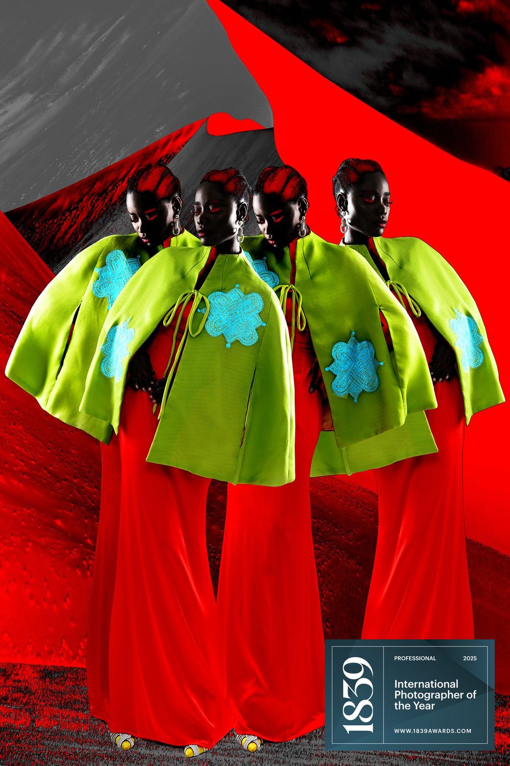 Later, I stripped the desert images down to black and white, then pushed them back into a vivid, almost surreal red through a mix of processes. Placing Ololade in that world just clicked—her presence had such strength that she seemed to belong there naturally. Suddenly they felt dreamlike, almost unreal. It reminded me of something from my past: when I first arrived in London in 1985, I saw a Citroën advert with Grace Jones. It was surreal, unforgettable, and a little outrageous. Dreams come from that same place—half fashion, half hallucination.
